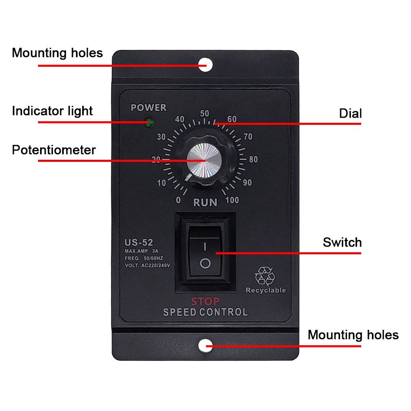 US-52 régulateur de vitesse pour moteurs AC 220V 400W, précis, sûr et facile à utiliser pour projets domestiques, industriels et DIY.